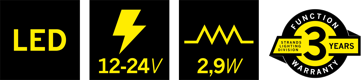 - Consumption specific function White: 2,9W / Amber, red, purple, green, blue:1W